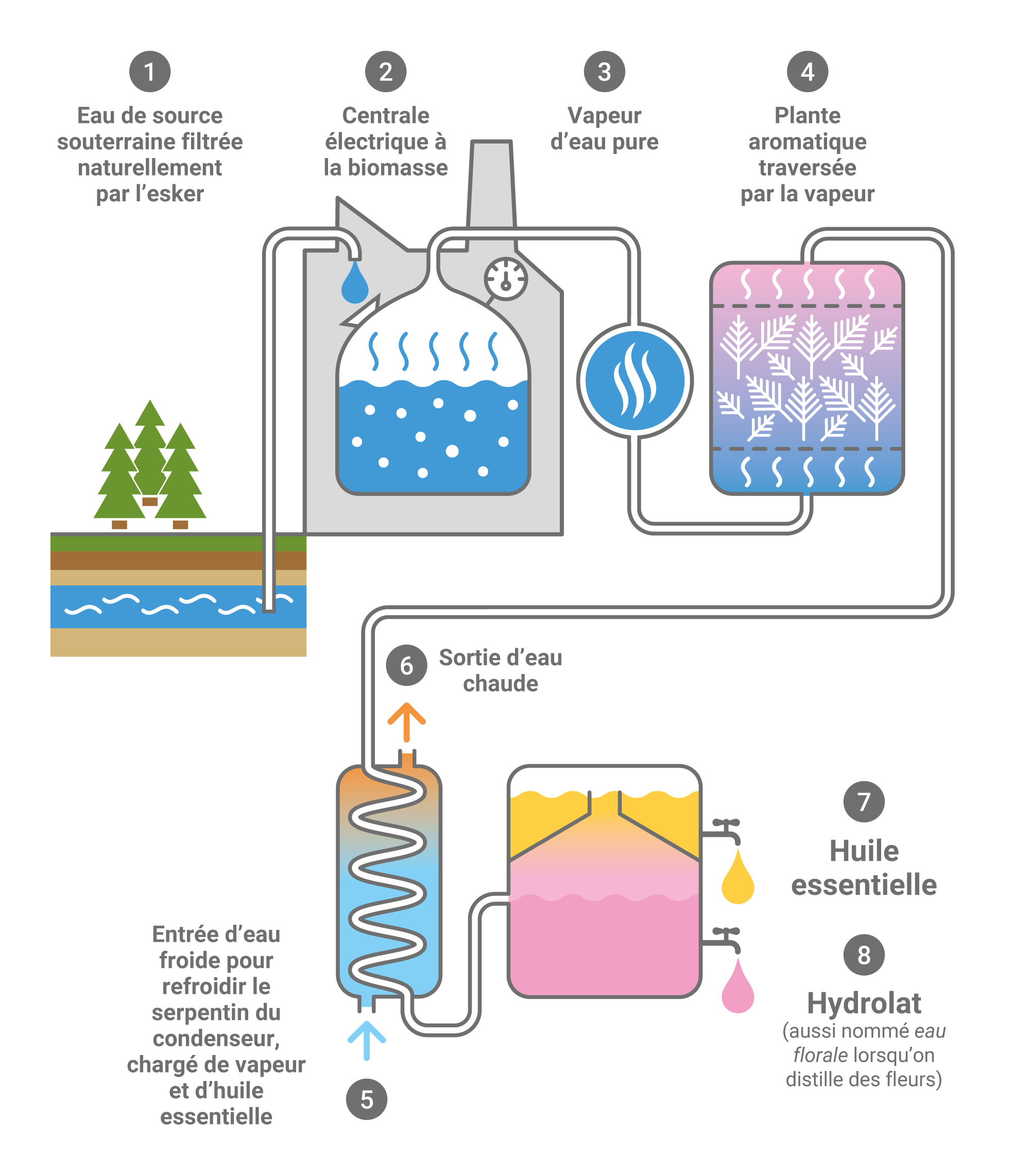 Chaque étape, de la récolte des arbres par les forestières jusqu'à l'embouteillage, est minutieusement surveillée, contrôlée et documentée. L'ensemble des opérations est certifié par Ecocert Canada, garantissant la conformité aux normes biologiques, ainsi que par le BNQ-CEAF, certifiant le respect des exigences environnementales du Québec en matière d'aménagement forestier.